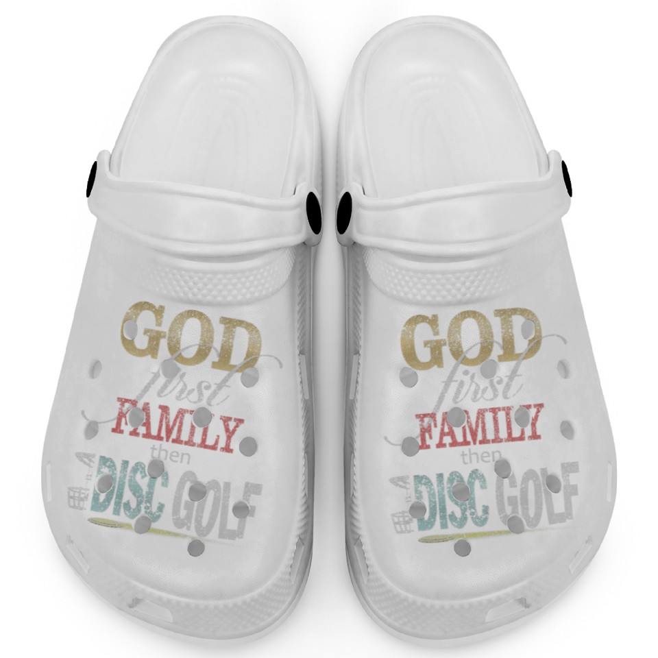 Buy eye-catching God First Family Then Disc Golf Distressed Clogs or see more Clogs products at Printblur shop now to explore many surprises from our shop!