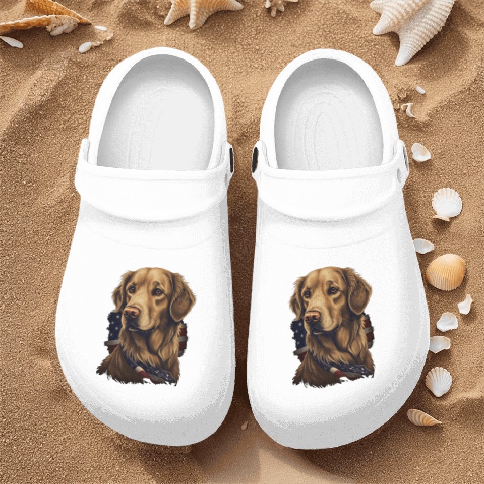 The item hot trend you're looking at is Golden Retriever American Flag Dog Lover Nurse Clogs For Men WHITE belong theme Nurse Clogs at Printblur