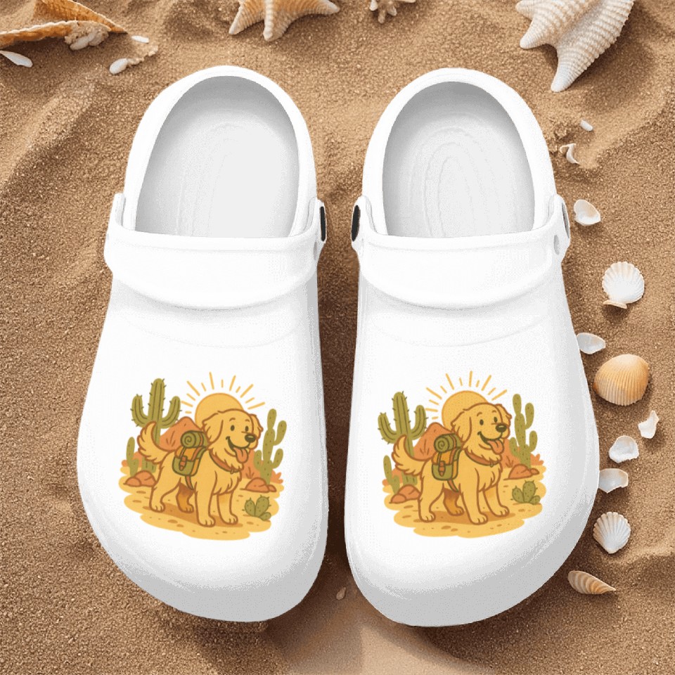 You're looking at the eye-catching product Golden Retriever Desert Hike Nurse Clogs For Men WHITE belong theme Nurse Clogs at Printblur