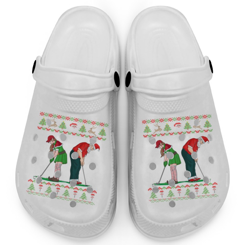 You're taking a peek at the product Golf Elf Golfer Ugly Christmas Santa Claus Golfing Clogs For Kids WHITE belong theme Clogs at Printblur