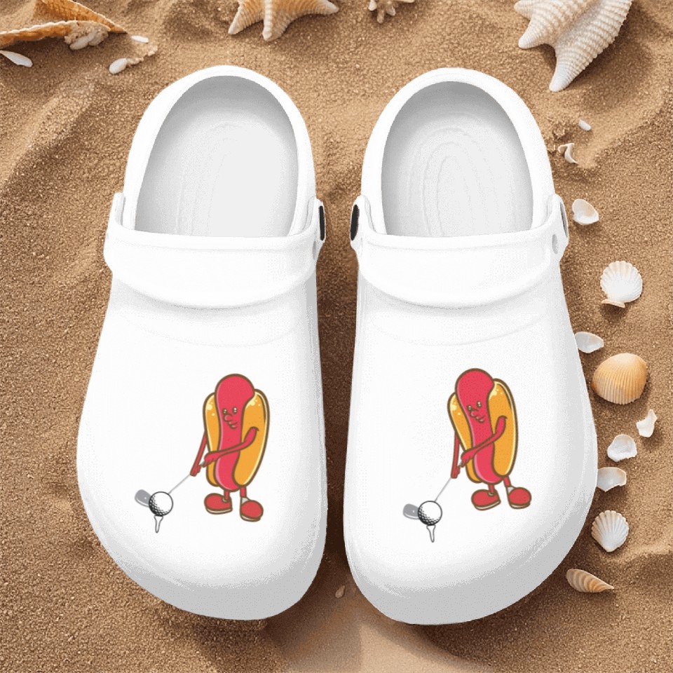 The item hot trend you're looking at is Golf Hotdog Golfing Sausage Golf Player Nurse Clogs For Men WHITE belong theme Nurse Clogs at Printblur