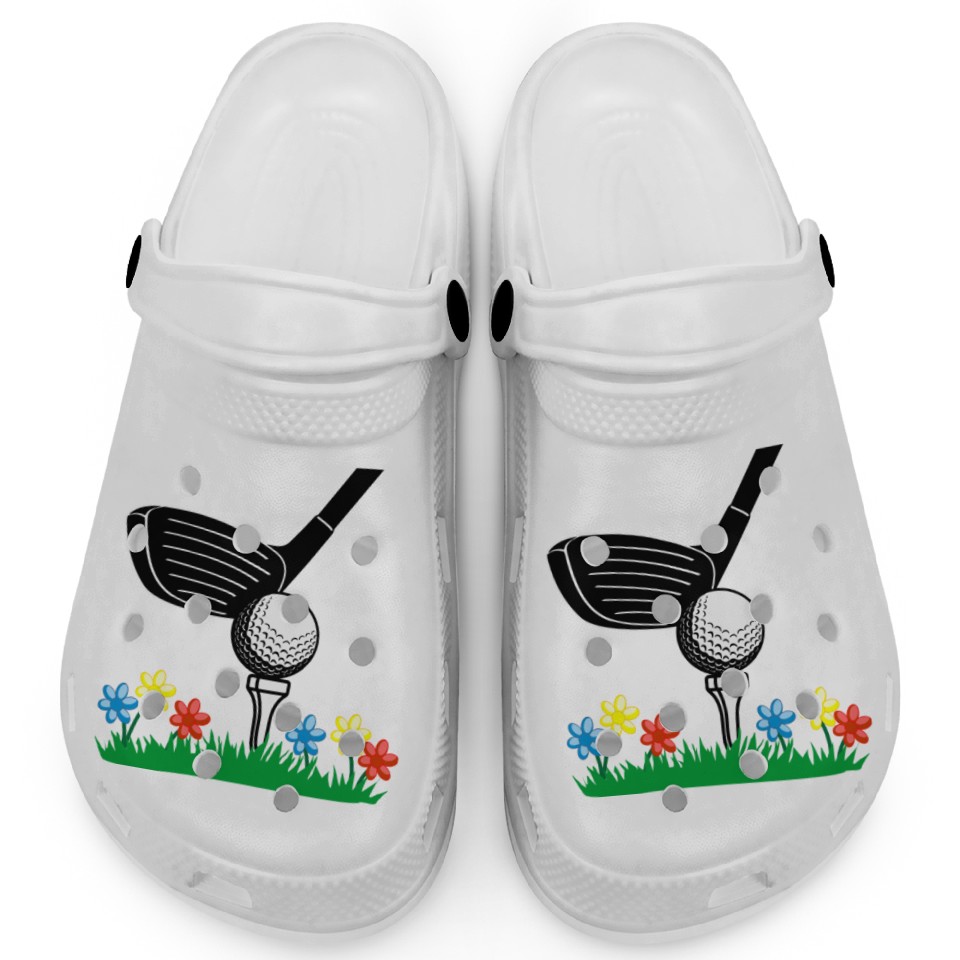 Own fascinating Golf stick and ball on grass field with flowers Clogs or see more Clogs products now from Printblur shop to enjoy your shopping time!