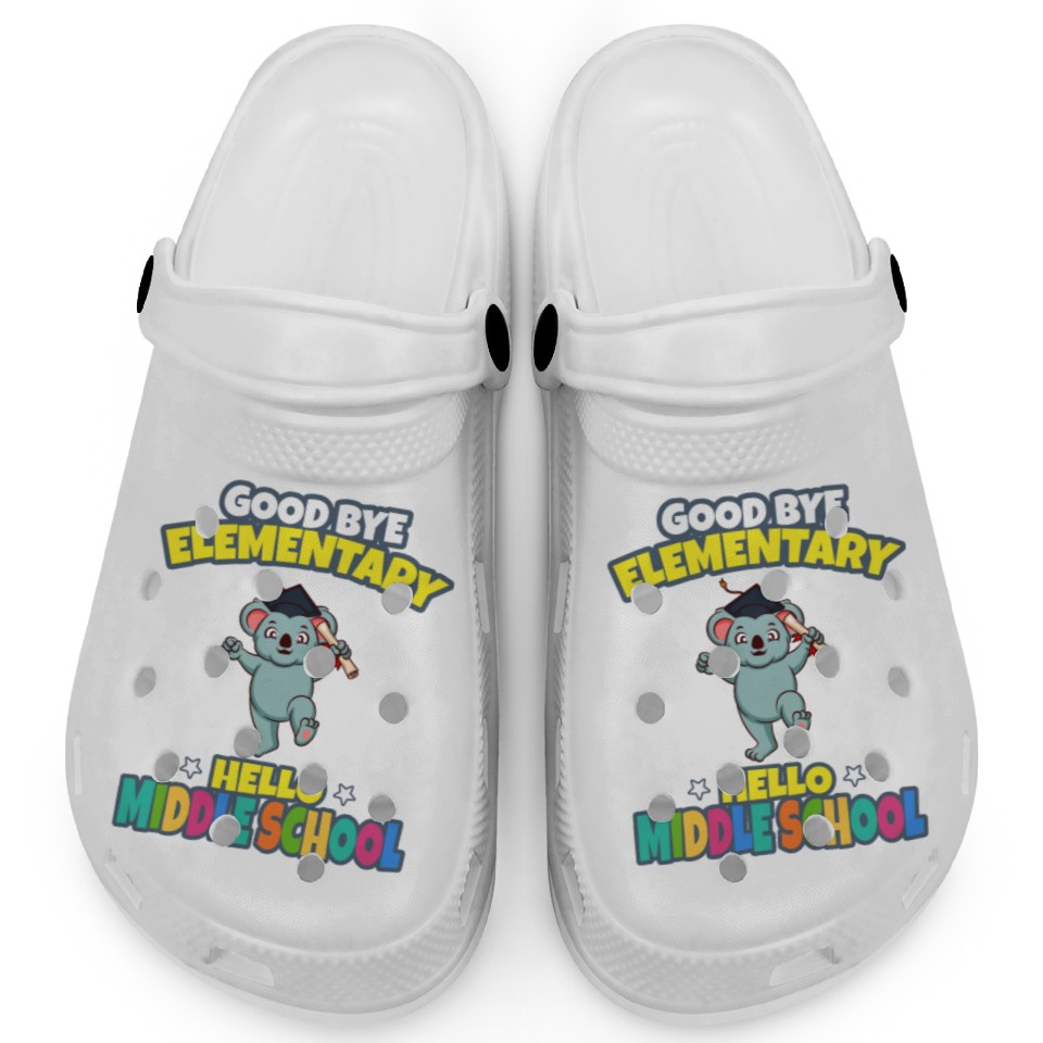 You are viewing an exclusive and elegant product Good Bye Elementary Hello Middle School Graduation Clogs For Kids WHITE belong theme Clogs at Printblur