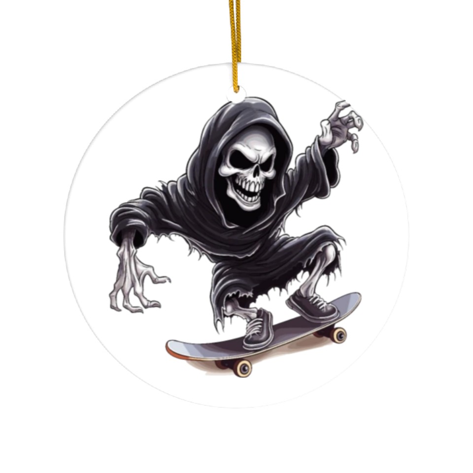 The item hot trend you're looking at is Grim Reaper Shreds the Streets: Skateboarding for Ceramic Ornaments For WHITE belong theme Ceramic Ornaments at Printblur