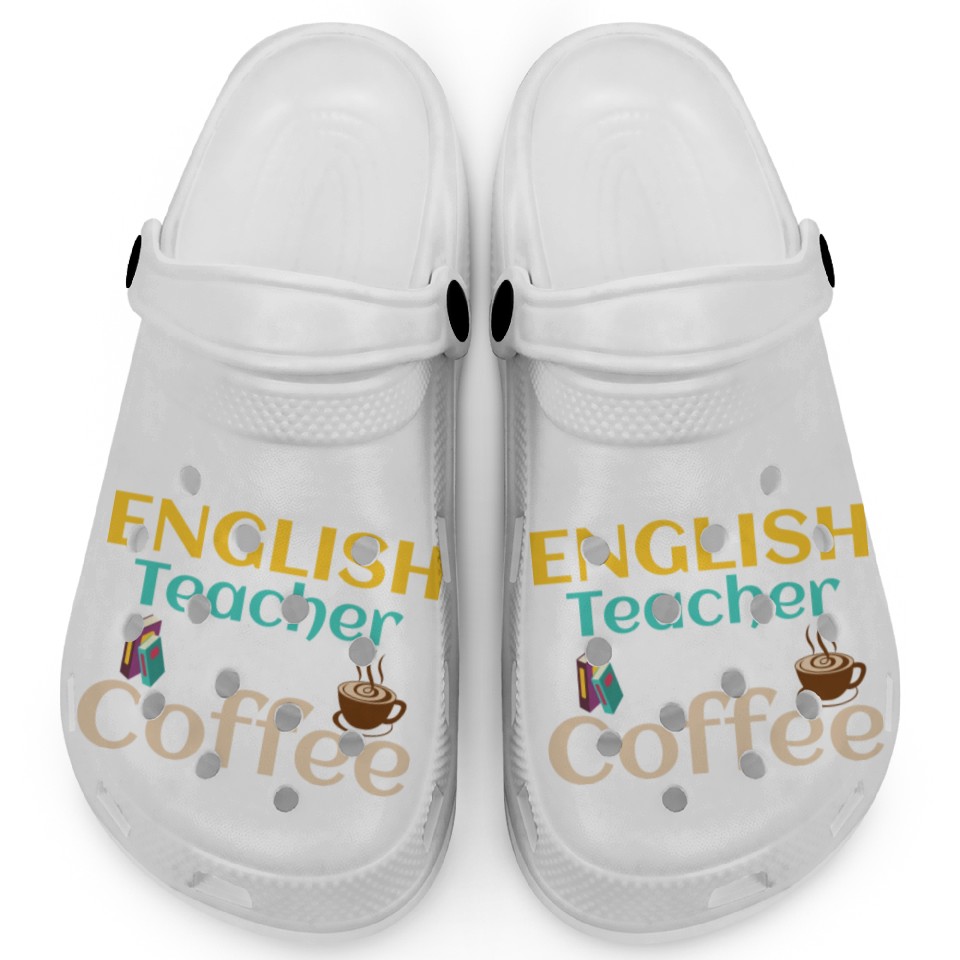 The item hot trend you're looking at is Half English Teacher Half Coffee Language Grammar Clogs For Kids WHITE belong theme Clogs at Printblur