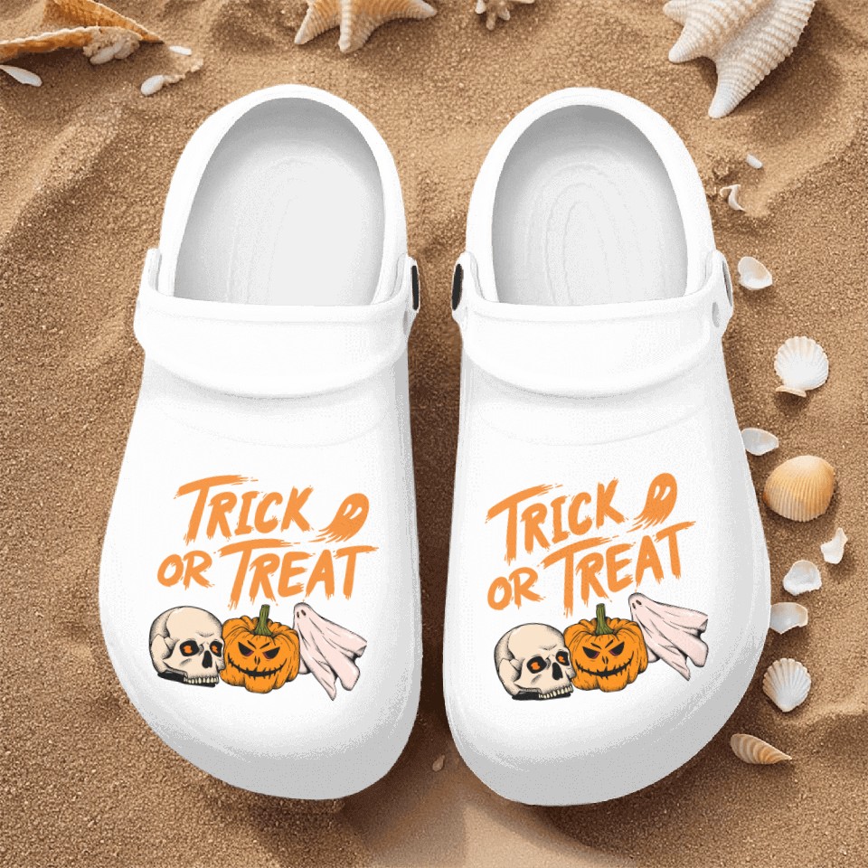 The item hot trend you're looking at is Halloween scary pumpkin head, skull and ghost Nurse Clogs For Men WHITE belong theme Nurse Clogs at Printblur