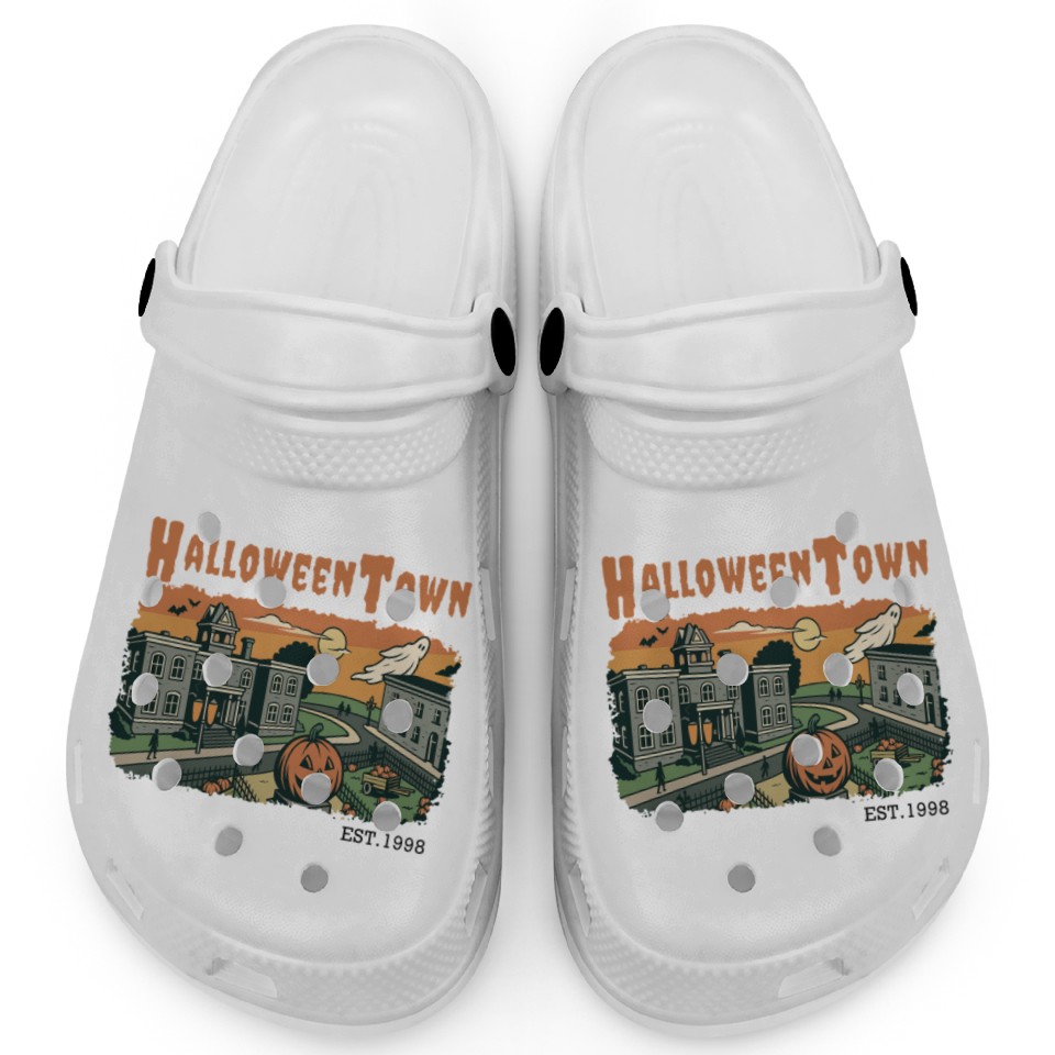 You're looking at the eye-catching product Halloweentown Spooky Sunset Scene – Vintage Hallow Clogs For Kids WHITE belong theme Clogs at Printblur