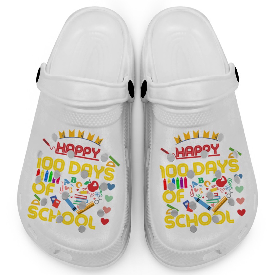 You're taking a peek at the product Happy 100 Days of School Celebration Clogs For Kids WHITE belong theme Clogs at Printblur