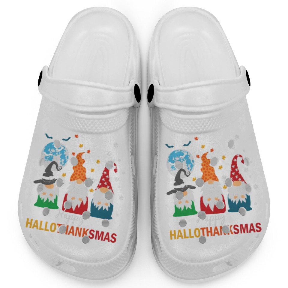 You are shopping for a stunning and trendy product Happy Hallothanksmas Gnomes Lover Halloween Clogs For Kids WHITE belong theme Clogs at Printblur