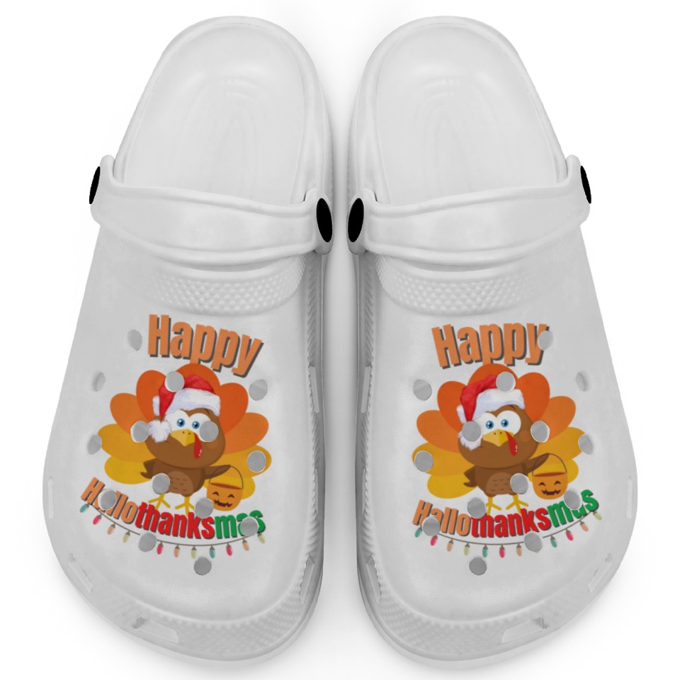 You are seeing a unique and impressive product Happy Hallothanksmas Trick or Treat Santa Turkey Clogs For Kids WHITE belong theme Clogs at Printblur