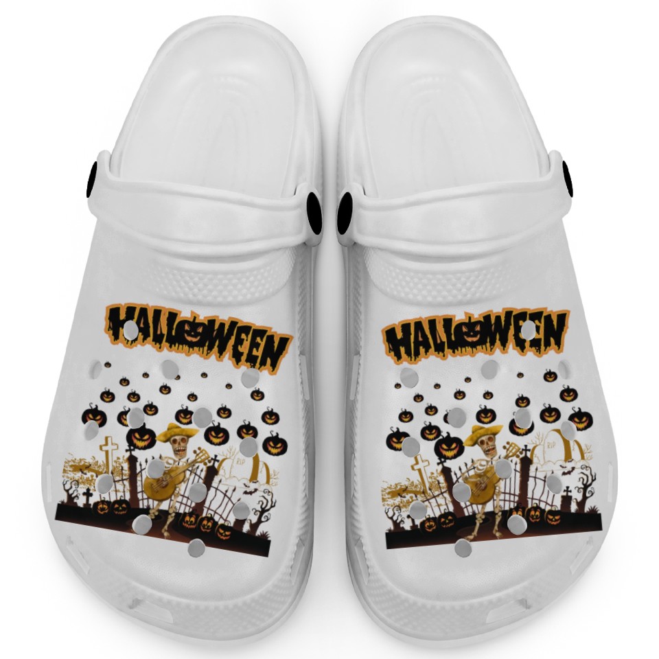 Buy eye-catching Happy Halloween Funny Skeleton Playing Guitar Clogs or see more Clogs products at Printblur shop now to explore many surprises from our shop!