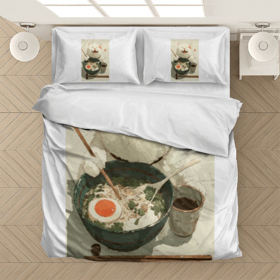 The product unique design you searched for is Happy White Cat Eating Ramen Bedding Sets For WHITE belong theme Bedding Sets at Printblur