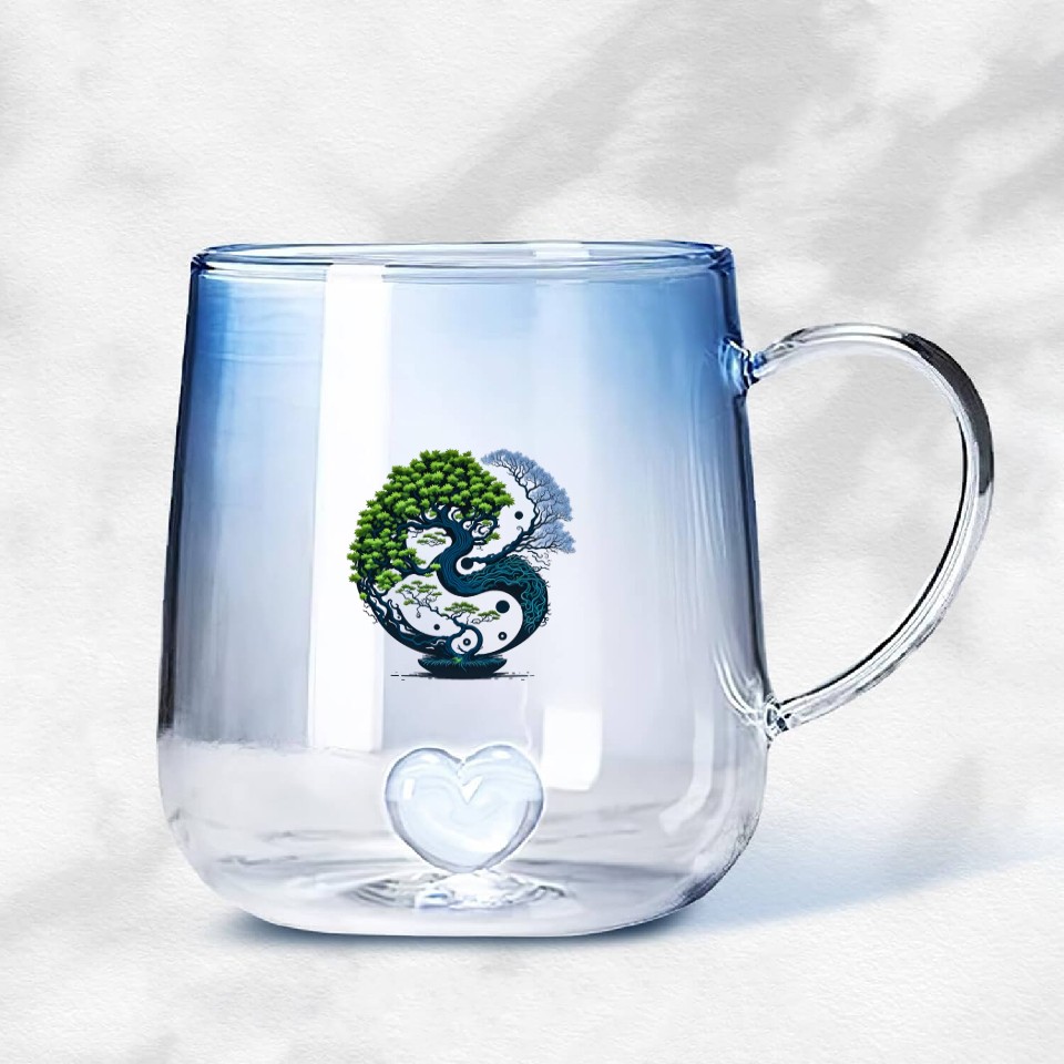 You are viewing an exclusive and elegant product Harmony Unveiled - Yin and Yang Bonsai Gradient Glass Mugs For Blue belong theme Gradient Glass Mugs at Printblur