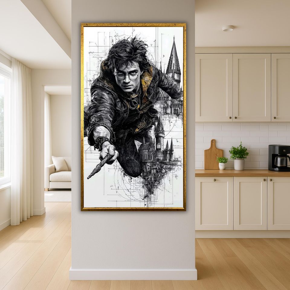 Own fascinating Harry Potter - Ink Illustration Print Spellcasting in Flight Above Hogwarts Towers or see more Premium Matte Vertical Posters products now from Printblur shop to enjoy your shopping time!