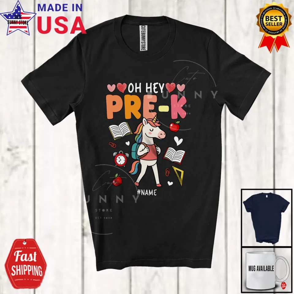 Own fascinating Hey Pre-K; Joyful Back To School Custom Name Girl Unicorn Students Teacher Shirt or see more Custom T-Shirts products now from Printblur shop to enjoy your shopping time!