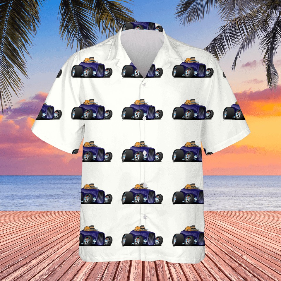 Buy eye-catching Highboy hot rod deep purple roadster Hawaiians or see more Hawaiians products at Printblur shop now to explore many surprises from our shop!