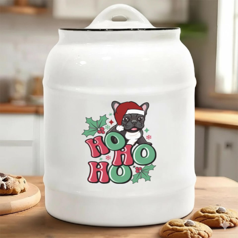Own fascinating HO HO HO French Bulldog Holly Leaf Funny Ceramic Cookie Jars or see more Ceramic Cookie Jars products now from Printblur shop to enjoy your shopping time!