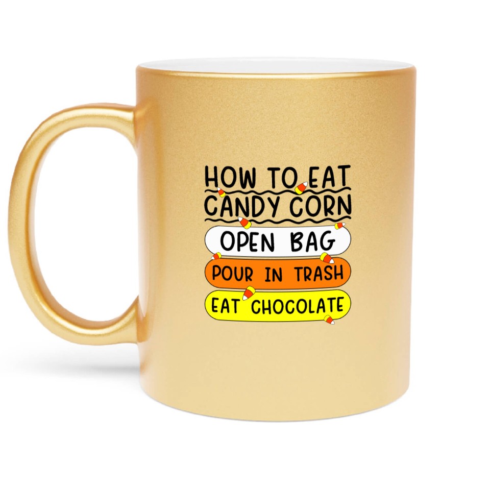You're searching for a one-of-a-kind product How To Eat Candy Corn Funny Candy Corn Halloween Metallic Mugs For Gold belong theme Metallic Mugs at Printblur