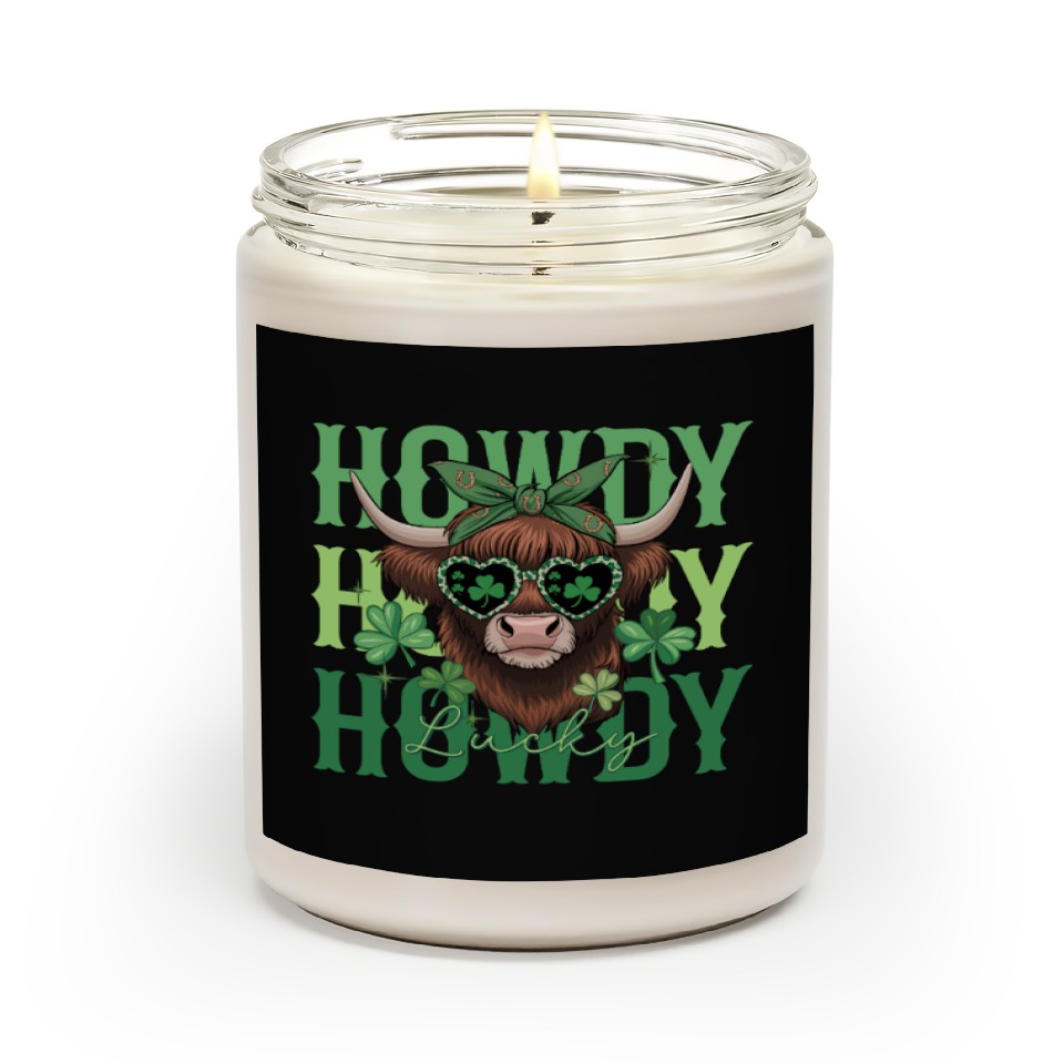 The product unique design you searched for is Howdy Howdy Lucky Highland Cow St Patricks Day Scented Candles For Black belong theme Scented Candles at Printblur