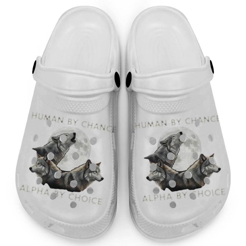 Own fascinating Human by chance, alpha by choice Wolf Moon Clogs or see more Clogs products now from Printblur shop to enjoy your shopping time!