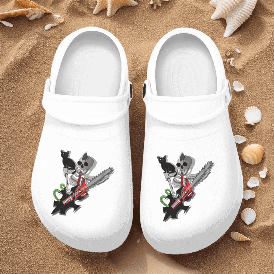 You are viewing an exclusive and elegant product Human Skeleton guitarist with his cat Nurse Clogs For Men WHITE belong theme Nurse Clogs at Printblur
