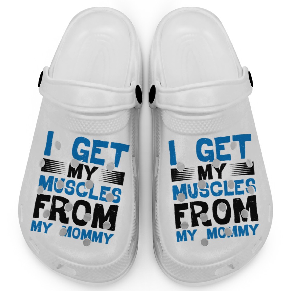 You are viewing one of the trendiest products I Get My Muscles From My Mommy Clogs For Kids WHITE belong theme Clogs at Printblur