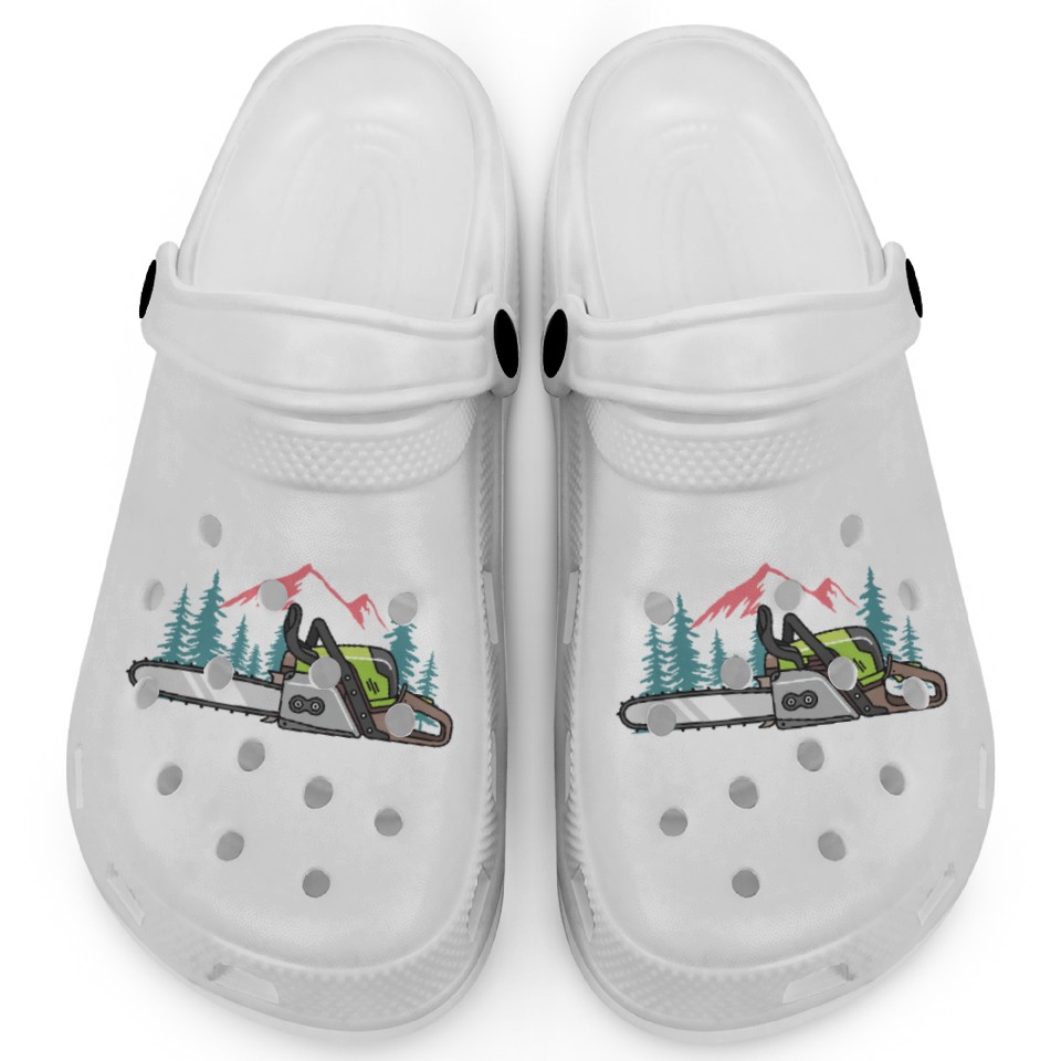 The item hot trend you're looking at is I Hug Trees With My Chainsaw for a Forest worker Clogs For Kids WHITE belong theme Clogs at Printblur
