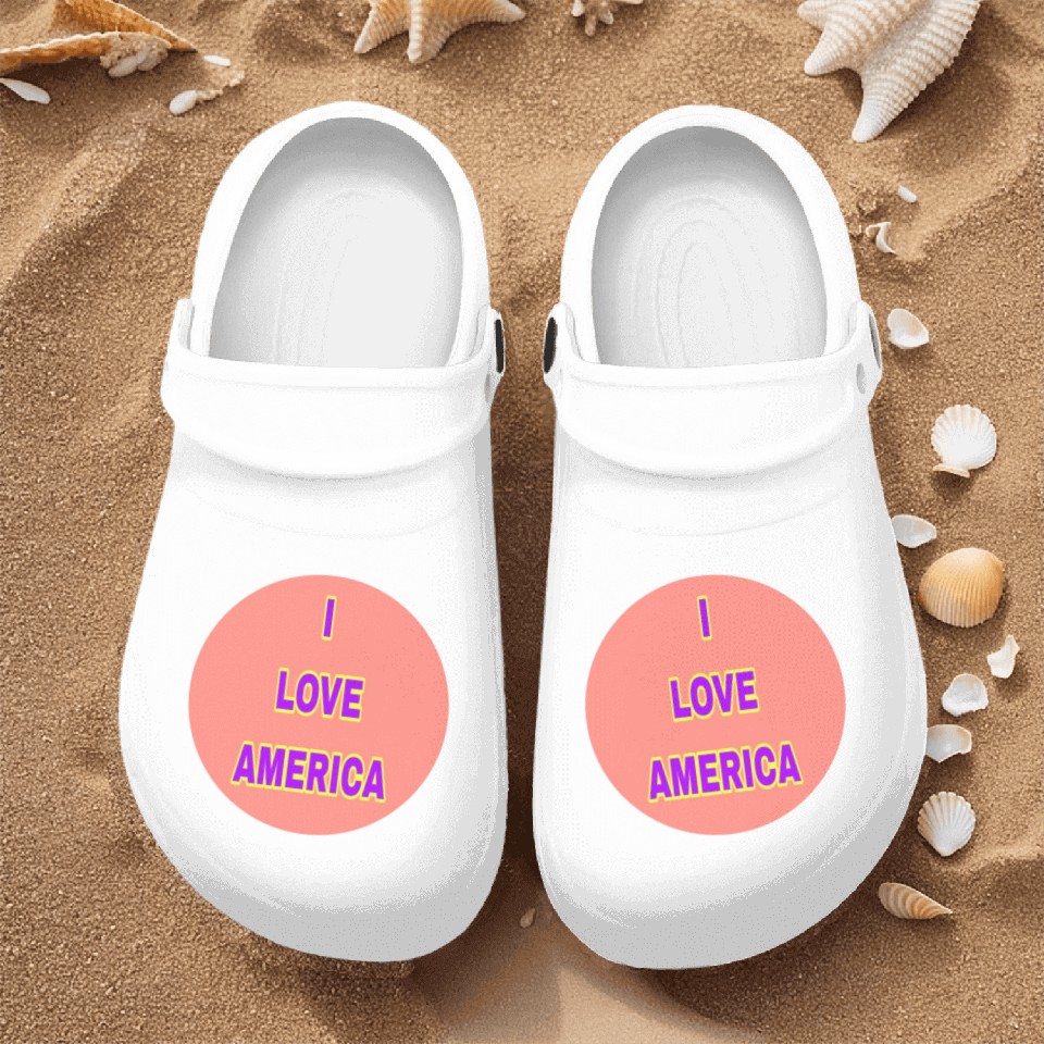 The item hot trend you're looking at is I LOVE AMERICA SUPER QUALITY Nurse Clogs For Men WHITE belong theme Nurse Clogs at Printblur
