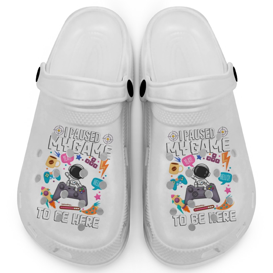 The product unique design you searched for is I Paused My Game To Be Here Clogs For Kids WHITE belong theme Clogs at Printblur