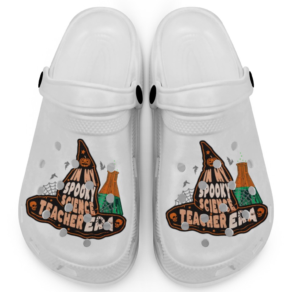 You're searching for a one-of-a-kind product In My Spooky Science Teacher Era Witch Clogs For Kids WHITE belong theme Clogs at Printblur