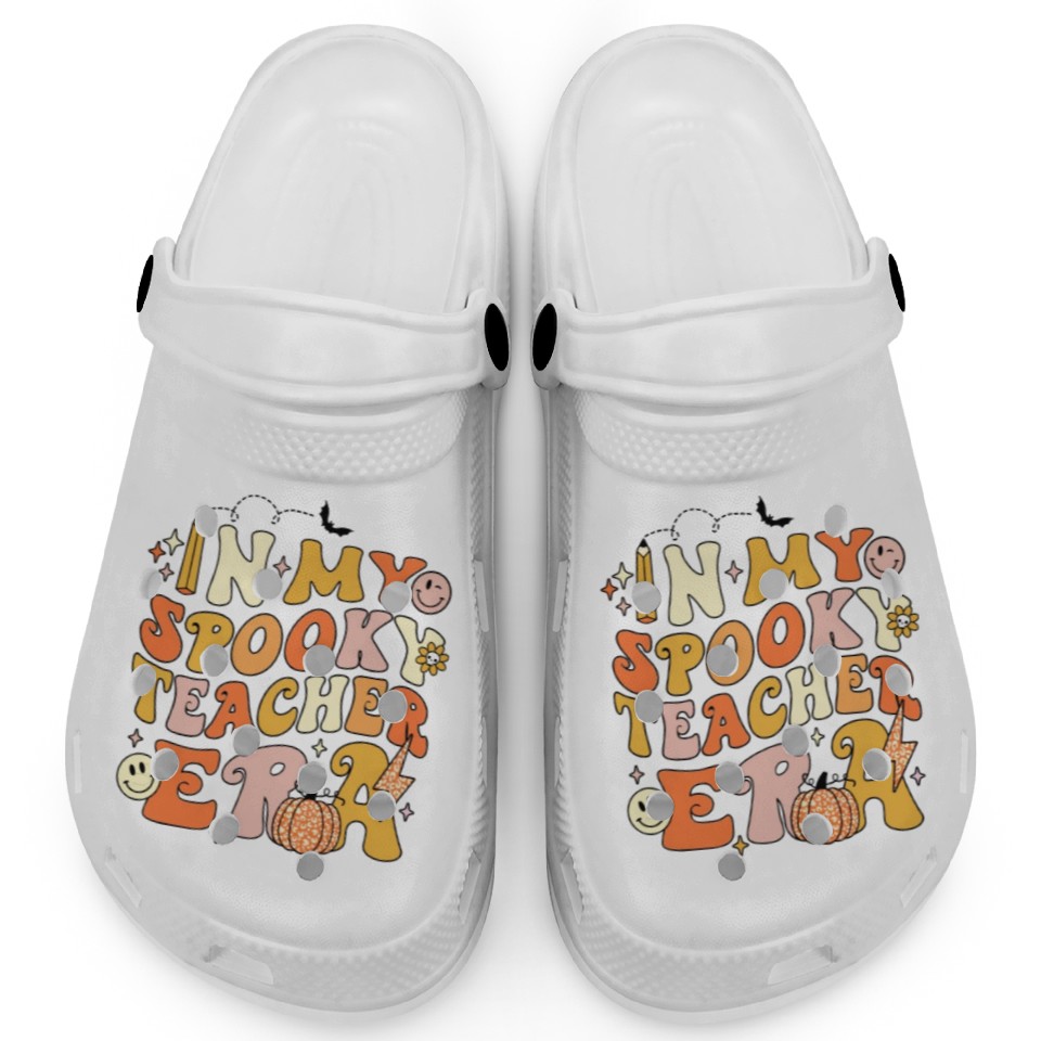 The item hot trend you're looking at is In My Spooky Teacher Era Clogs For Kids WHITE belong theme Clogs at Printblur
