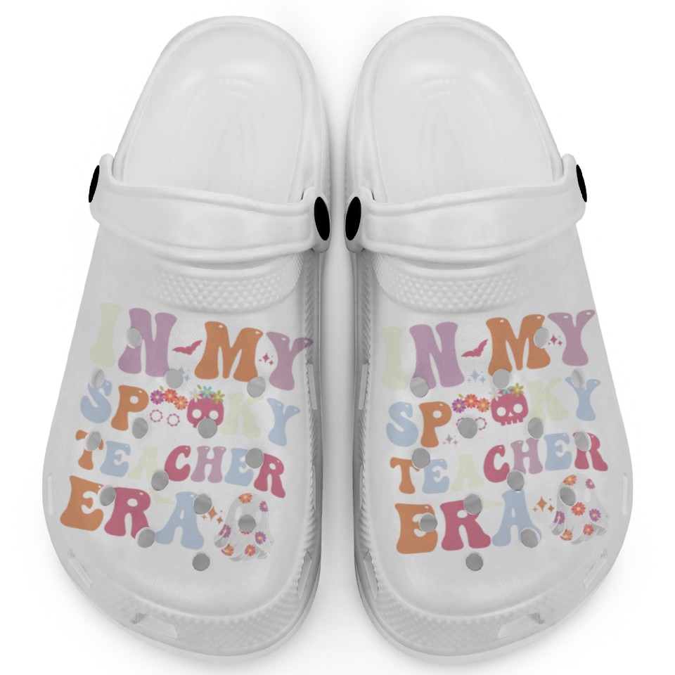 You are viewing an exclusive and elegant product In My Spooky Teacher Era Halloween Clogs For Kids WHITE belong theme Clogs at Printblur