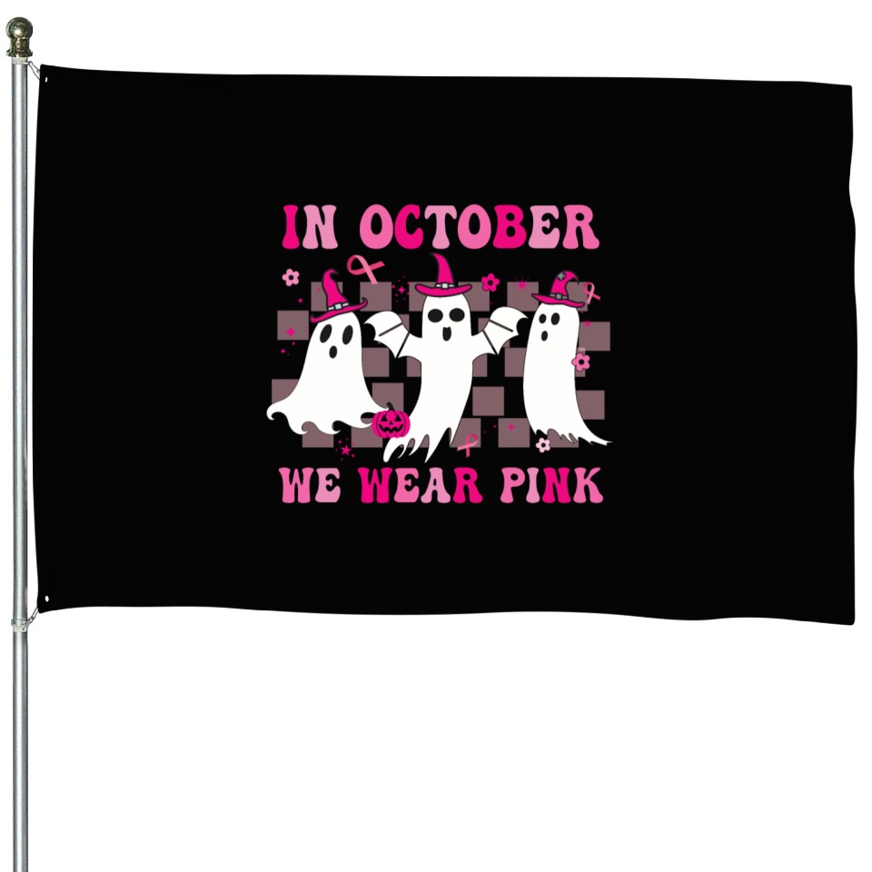 Buy eye-catching In October We Wear Pink Wizard Ghosts Halloween House Flags or see more House Flags products at Printblur shop now to explore many surprises from our shop!