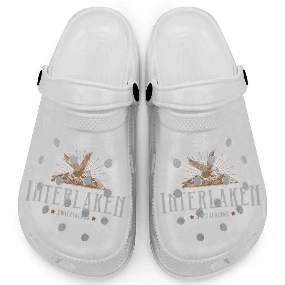 Buy eye-catching Interlaken Moains Switzerland Hiking Outdoors Clogs or see more Clogs products at Printblur shop now to explore many surprises from our shop!