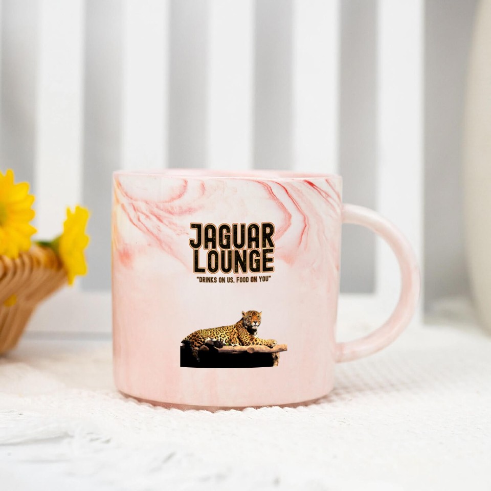 You are shopping for a stunning and trendy product JAGUAR LOUNGE "Drinks On Us, Food On You" FUNNY Marble Mugs For Pink belong theme Marble Mugs at Printblur