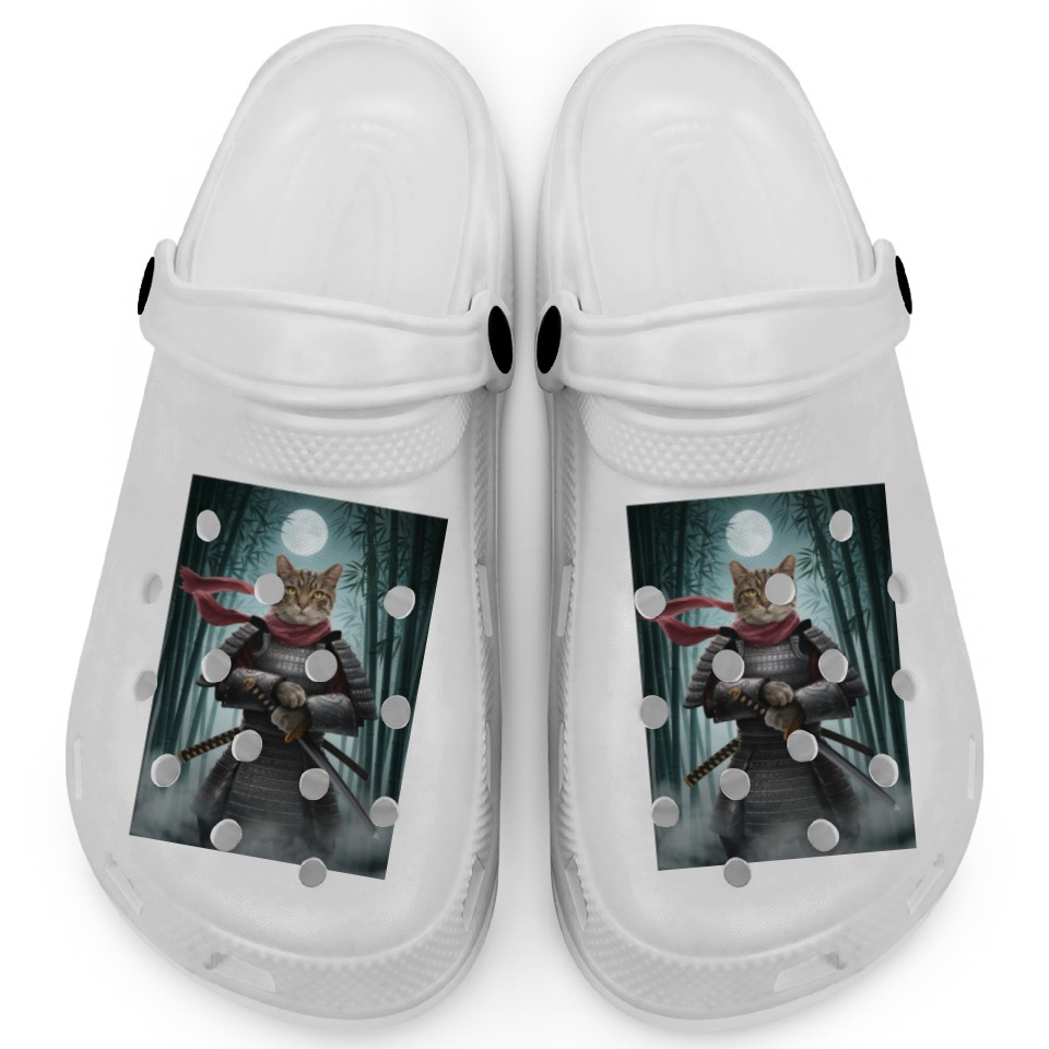 You're taking a peek at the product Japanese Cat Samurai Cat Clogs For Kids WHITE belong theme Clogs at Printblur