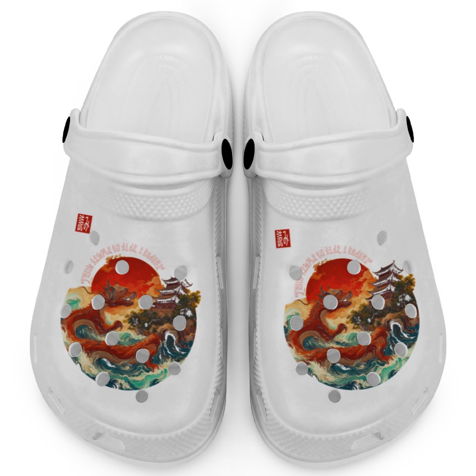 You're taking a peek at the product Japanese Dragon and Pagoda Sunset Art Clogs For Kids WHITE belong theme Clogs at Printblur