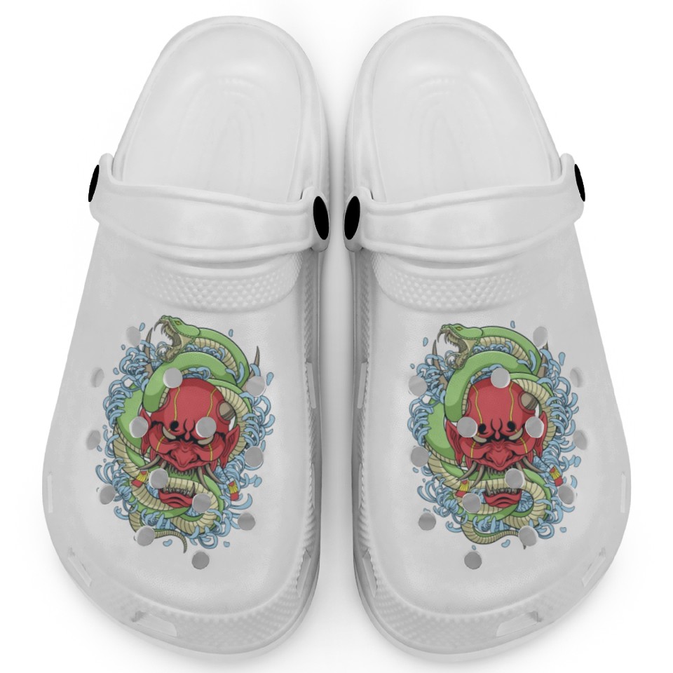 Buy stunning Japanese oni mask with peony flower and greem snak Clogs or see more Clogs products at Printblur right now to receive many amazing discounts!