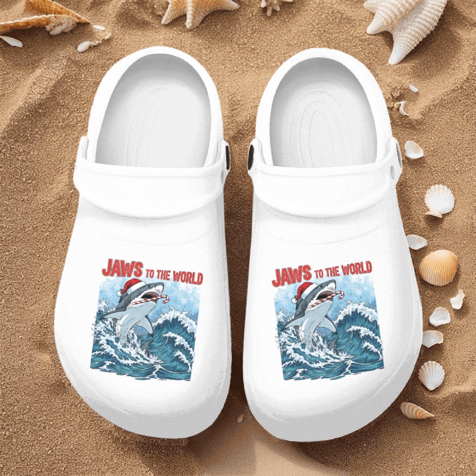 The item hot trend you're looking at is Jaws to the World – Christmastime Shark Attack Nurse Clogs For Men WHITE belong theme Nurse Clogs at Printblur