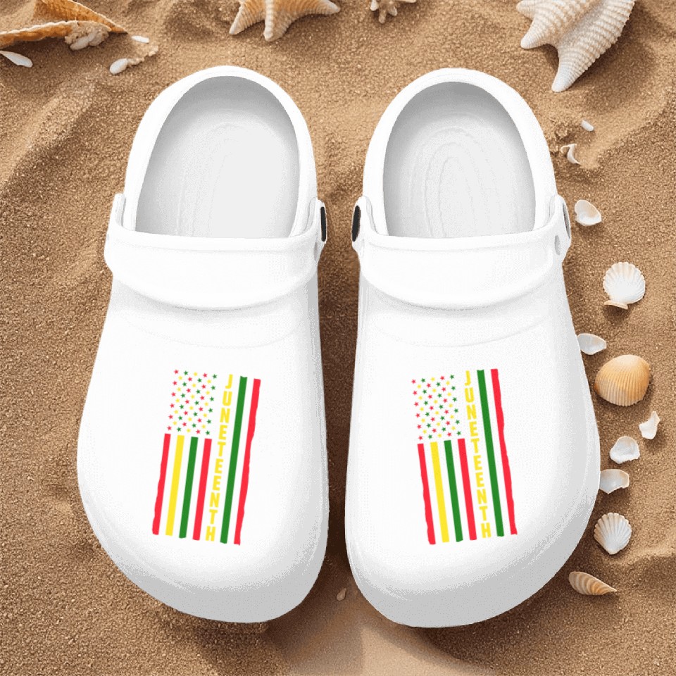 The product unique design you searched for is Juneteenth Color Flag Black African American Flag Nurse Clogs For Men WHITE belong theme Nurse Clogs at Printblur
