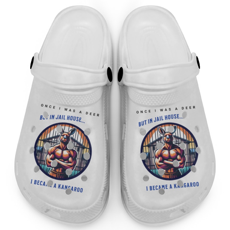 You are viewing an exclusive and elegant product Kangaroo breaks out of jail funny vector graphic Clogs For Kids WHITE belong theme Clogs at Printblur