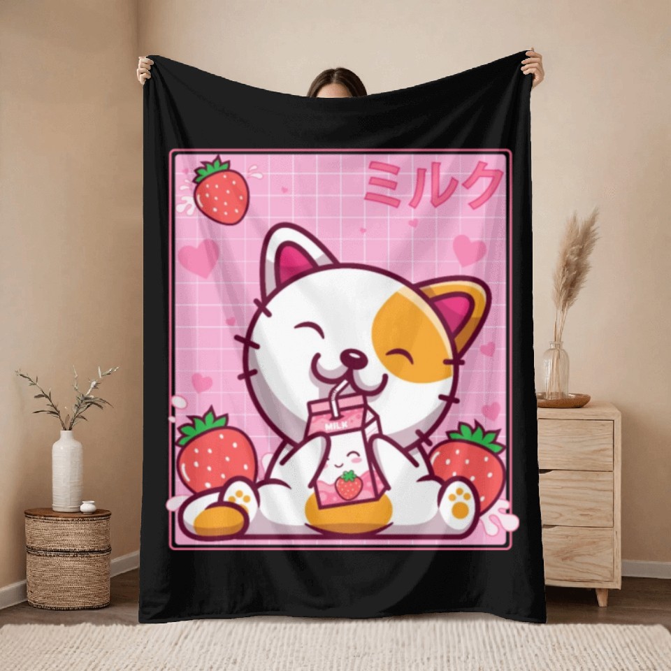 You are viewing an exclusive and elegant product Kawaii Kitten Cute Cat Strawberry Milk Shake Throw Blankets For Black belong theme Throw Blankets at Printblur