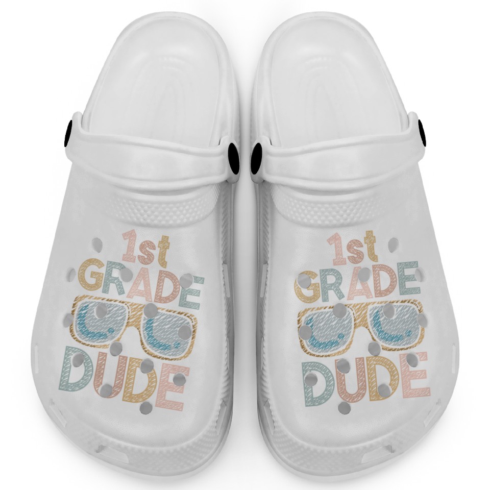 You're taking a peek at the product Kindergarten Teacher Funny Student 1st Graduation Clogs For Kids WHITE belong theme Clogs at Printblur