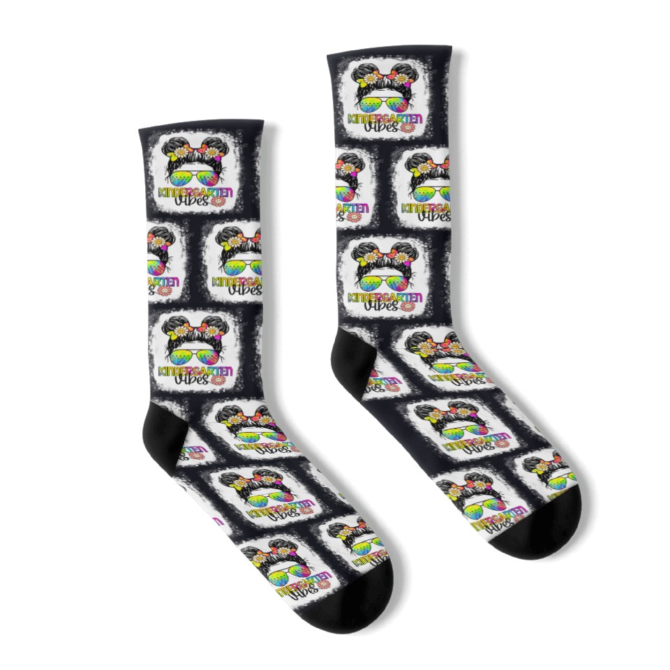 You're taking a peek at the product Kindergarten Vibes Bleached Messy Bun Girl Socks For Black belong theme Socks at Printblur