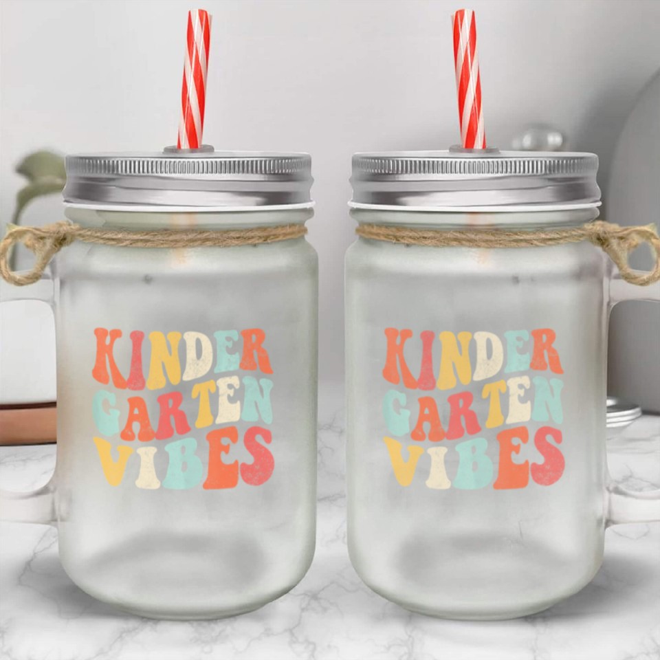 You are viewing one of the trendiest products Kindergarten Vibes Funny Back to School Cute Teach Mason Jar Cups For belong theme Mason Jar Cups at Printblur