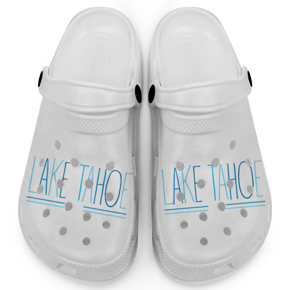 You are shopping for a stunning and trendy product Lake Tahoe Winter Snowflake Blue Lettering Clogs For Kids WHITE belong theme Clogs at Printblur