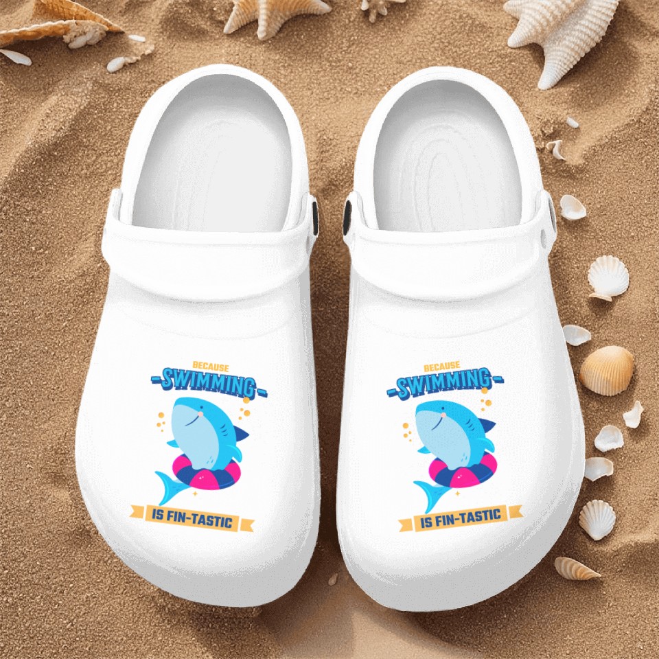 You're taking a peek at the product Learn To Swim Because Swimming Is Fin-Tastic Nurse Clogs For Men WHITE belong theme Nurse Clogs at Printblur