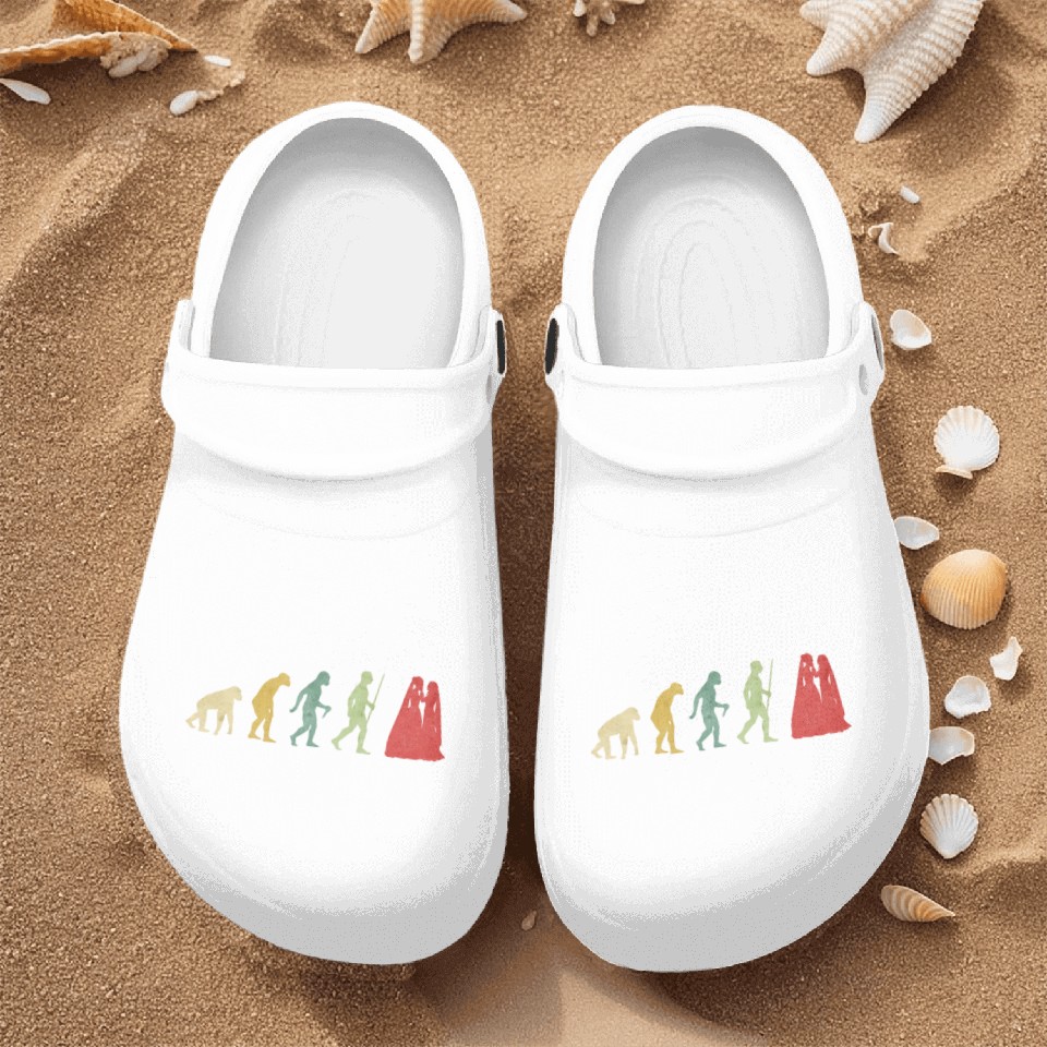 The product unique design you searched for is Lesbian Couple Romantic Wedding Wife Evolution Nurse Clogs For Men WHITE belong theme Nurse Clogs at Printblur