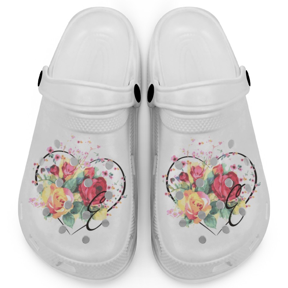 Own fascinating Letter E Monogram Floral Roses Heart Clogs or see more Clogs products now from Printblur shop to enjoy your shopping time!