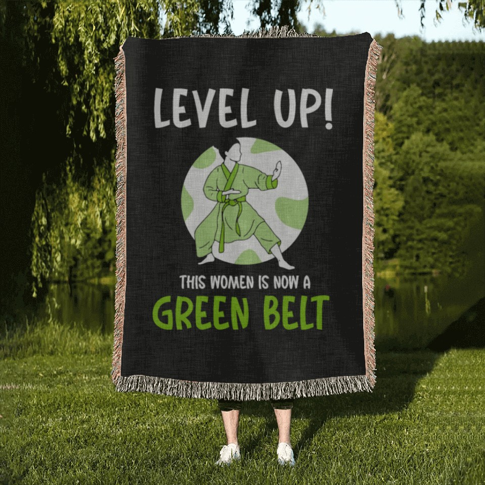 The product unique design you searched for is Level Up! This women is now a green belt Woven Blankets For Black belong theme Woven Blankets at Printblur